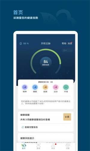 天和云脉app是一款专注健康监测服务的软件。为用户提供健康监测管理服务。让用户能知晓自己身体状况,及时改善身体健康问题,让每个用户都拥有健康好身体。天和云脉软件介绍:1、真正为用户健康着想的监测软件,是一款非常不错的服务平台,建立24小...